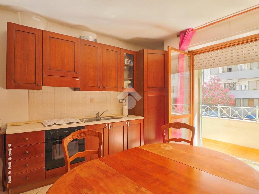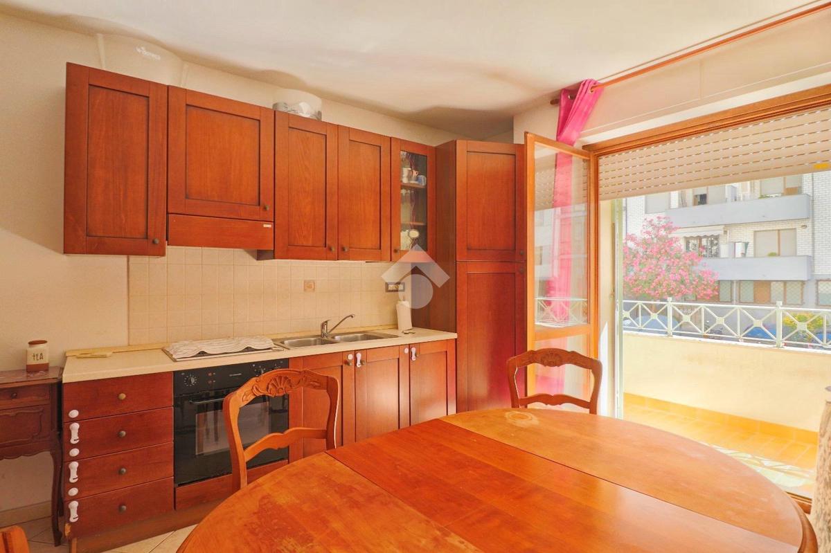 L’appartamento si apre su una spaziosa zona giorno con un pratico angolo cottura, un ambiente molto luminoso grazie a un’ampia porta finestra a due ante che affaccia sul retro del palazzo e conduce all’ampio balcone.
