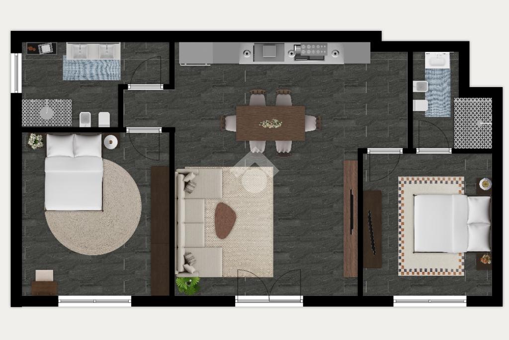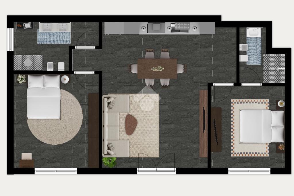 La zona notte comprende due camere da letto matrimoniali; la camera padronale è arricchita da un bagno privato en suite. A servizio della zona giorno è presente un secondo bagno, moderno e funzionale.