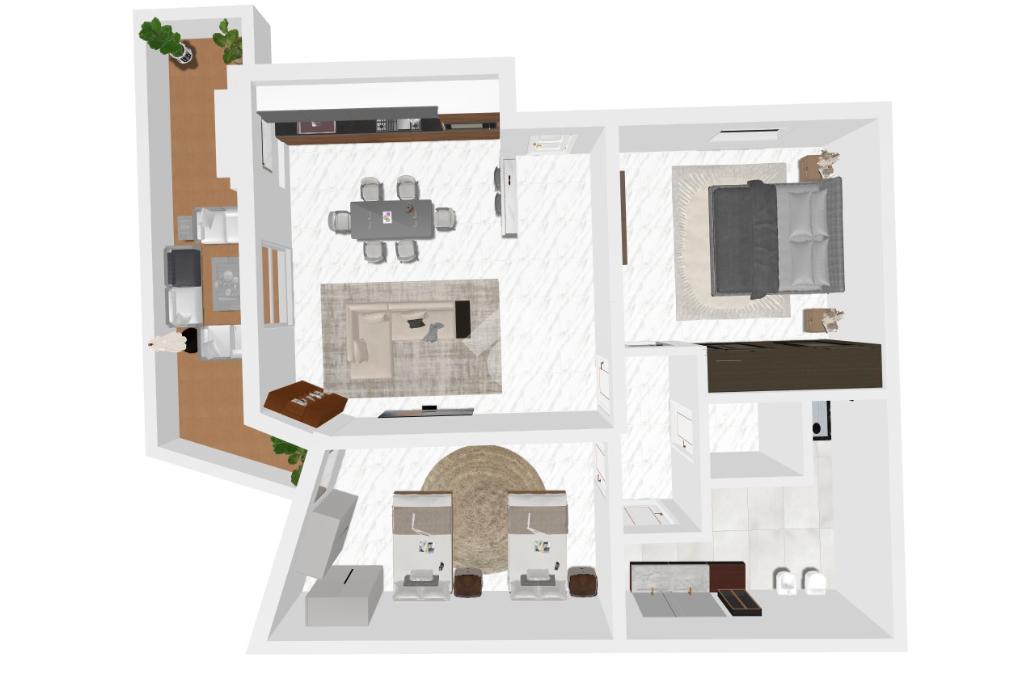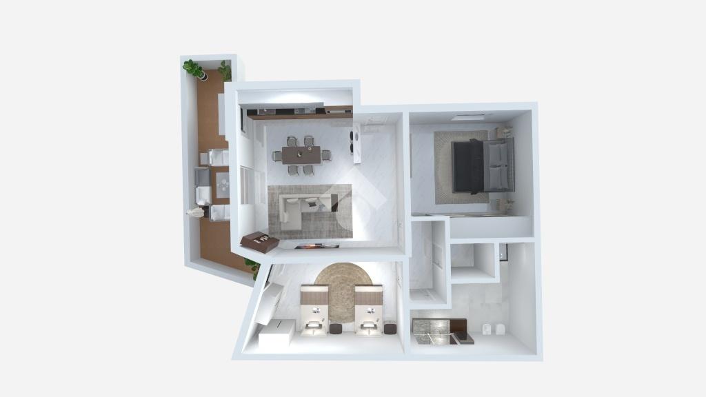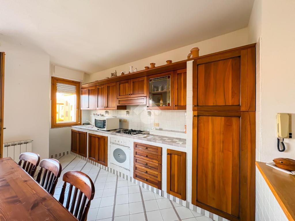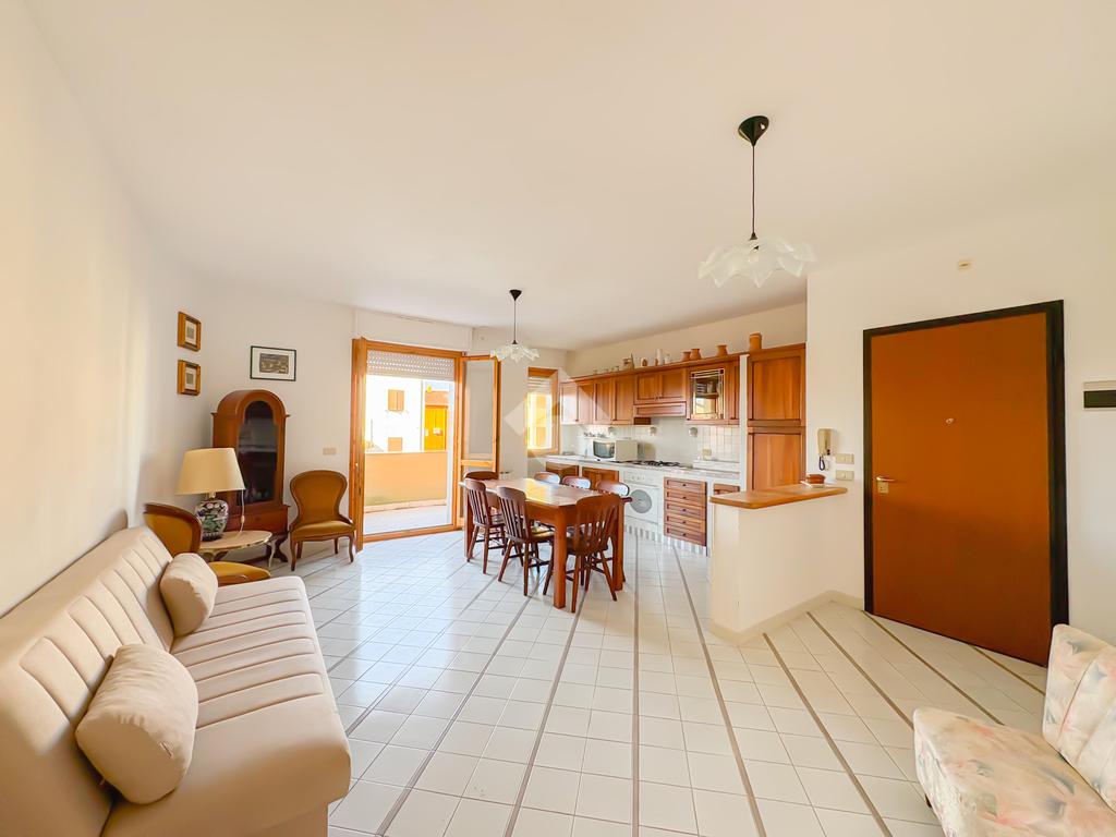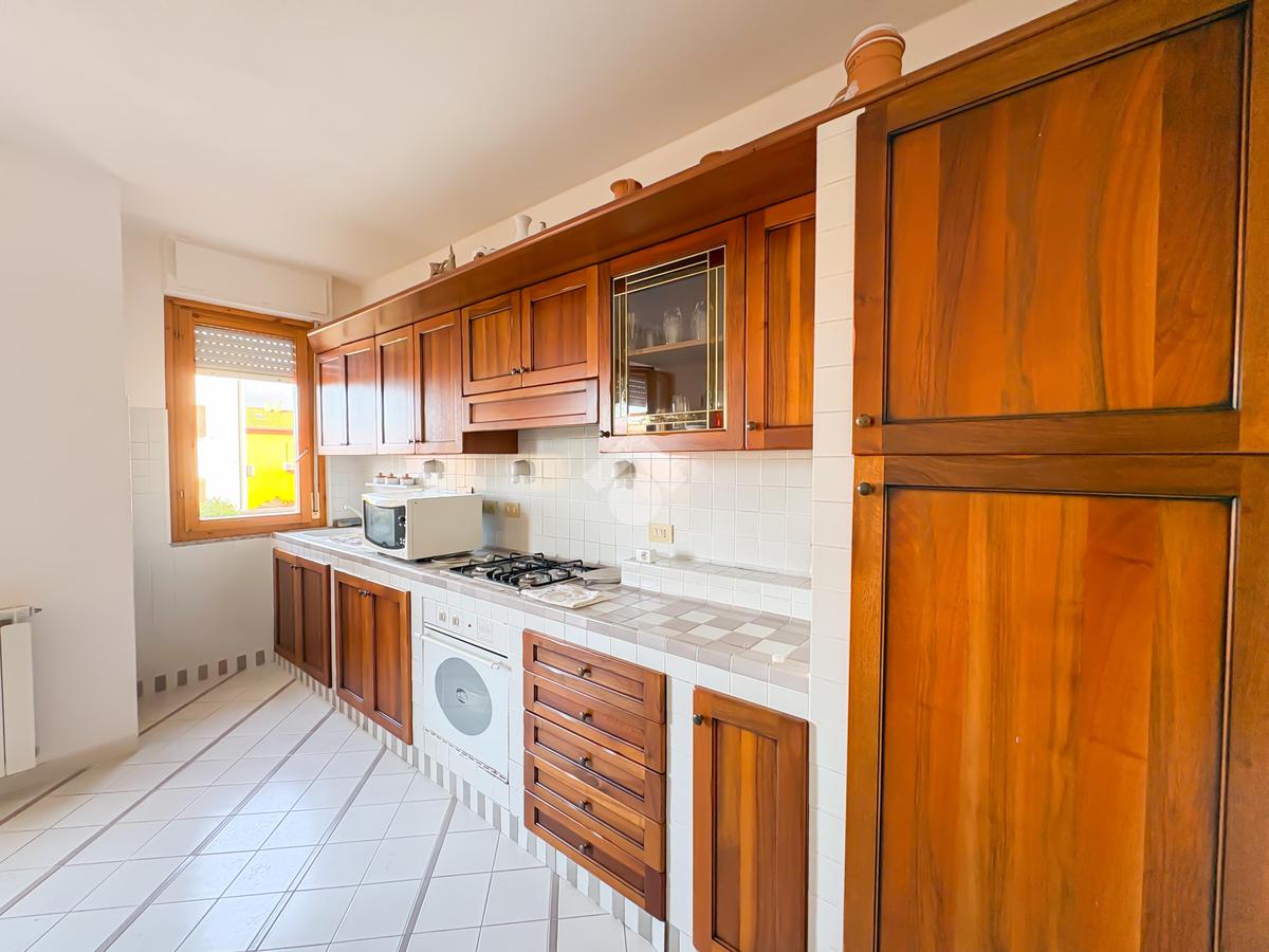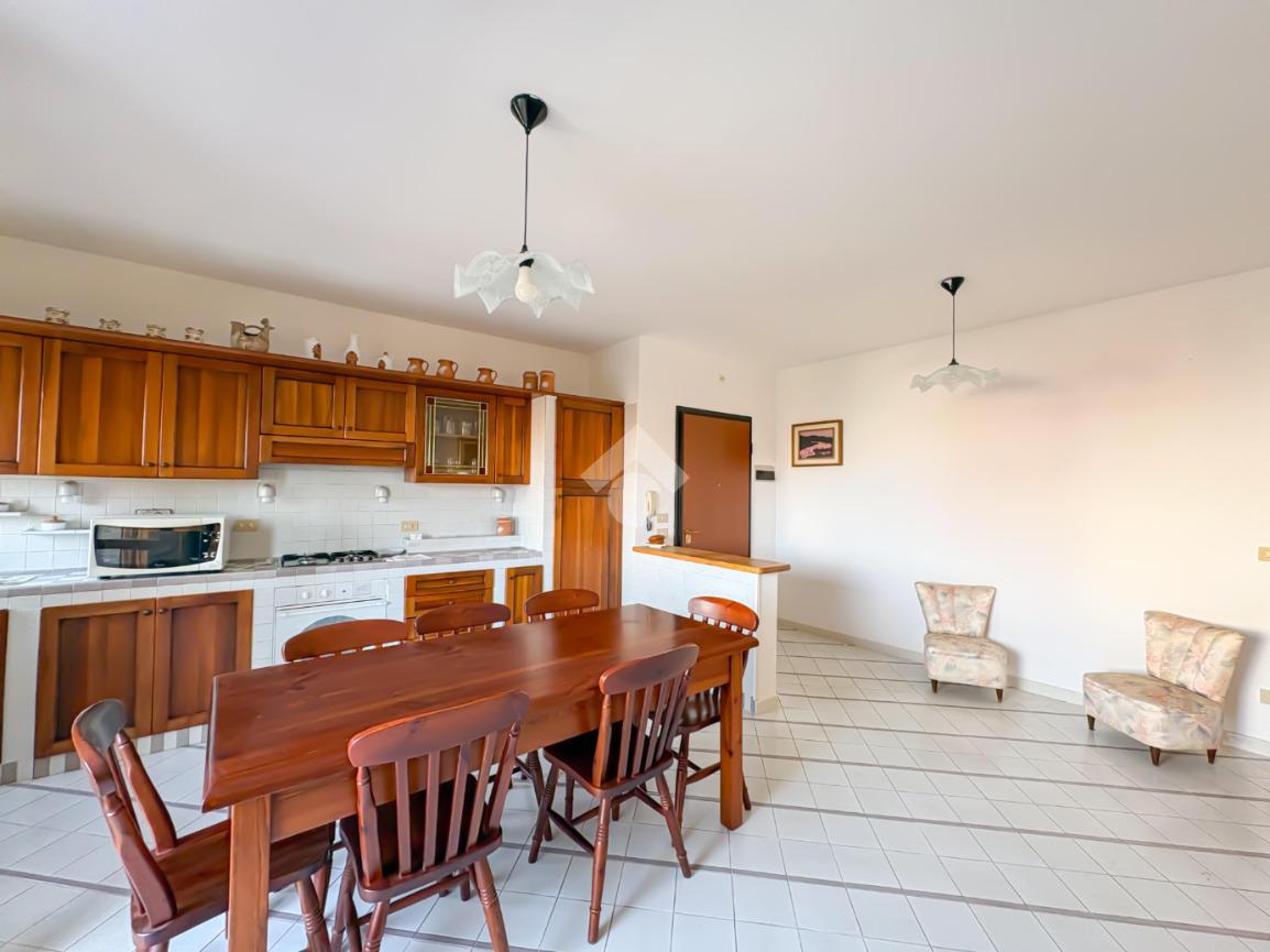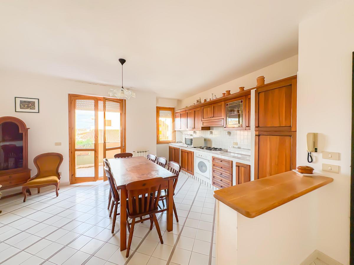 L’appartamento si apre su una comoda zona giorno con ampio angolo cottura. L’ambiente è particolarmente luminoso grazie a una finestra che affaccia direttamente sulla cucina e a un’ampia porta-finestra che conduce al balcone abitabile, ideale per pranzi e cene all’aperto durante la stagione estiva.
